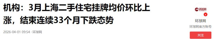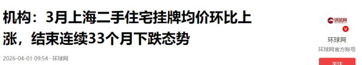 机构:3月上海二手住宅挂牌均价环比上涨,结束连续33个月下跌态势2026-04-01 09:54·环球网