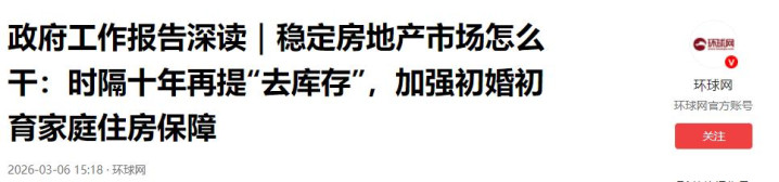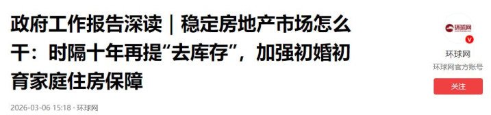 政府工作报告深读|稳定房地产市场怎么干:时隔十年再提“去库存”,加强初婚初育家庭住房保障 2026-03-06 15:18·环球网